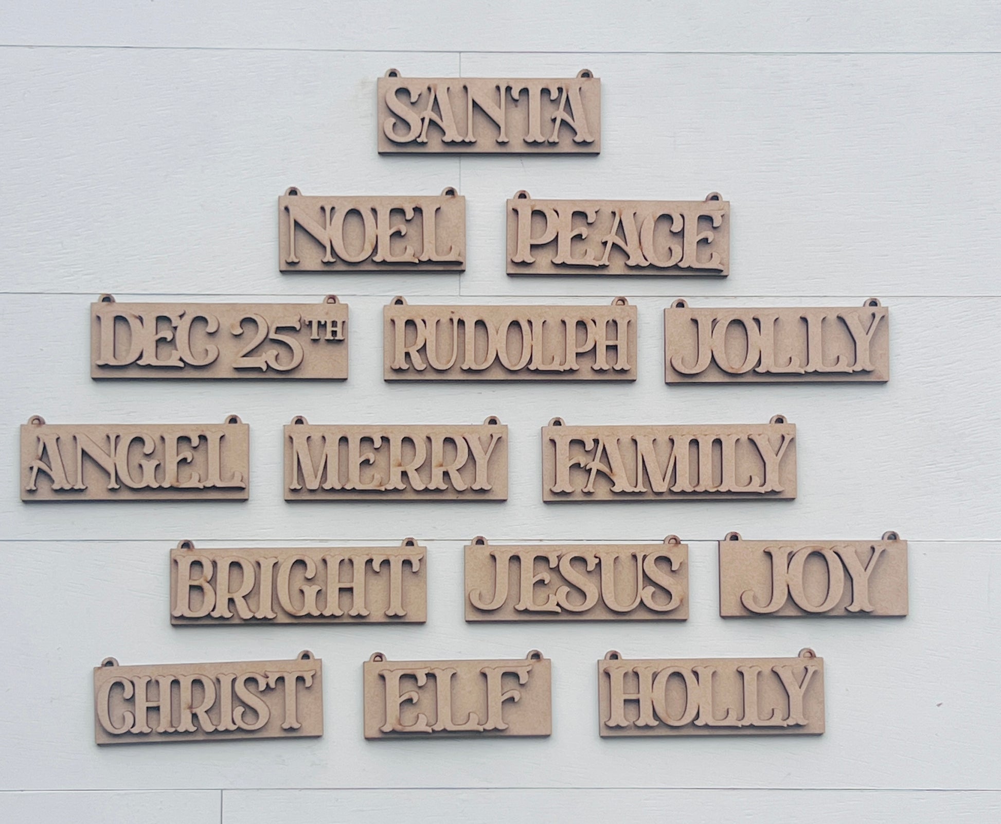 Add festive flair to your tree, garlands, or gifts with this classic word tag set! Featuring joyful holiday favorites like Santa, Peace, Joy, and Jesus, these layered pieces are perfect for painting, staining, or leaving natural for a rustic look.