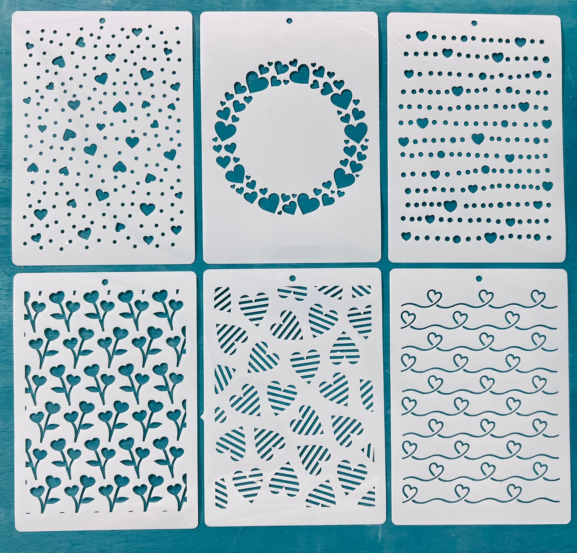 A collection of 8x6' reusable stencils with mixed heart patterns, dots, and borders. Ideal for layering paint and creating soft, playful Valentine backgrounds. Includes all 6 designs.