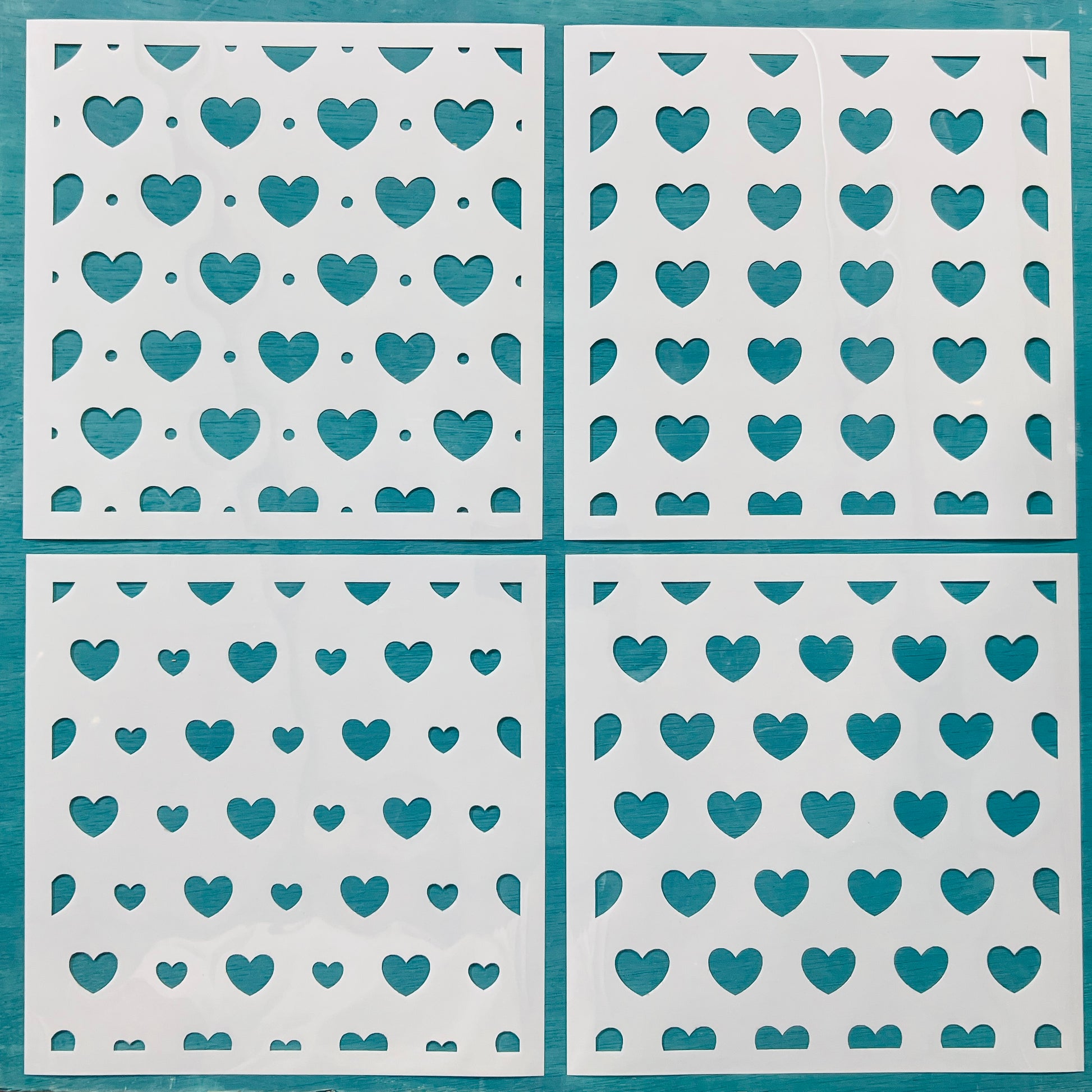 A reusable stencil set featuring (set of 4) 10x10 heart patterns in a variety of layouts. Great for adding texture and interest to painted signs and backgrounds.