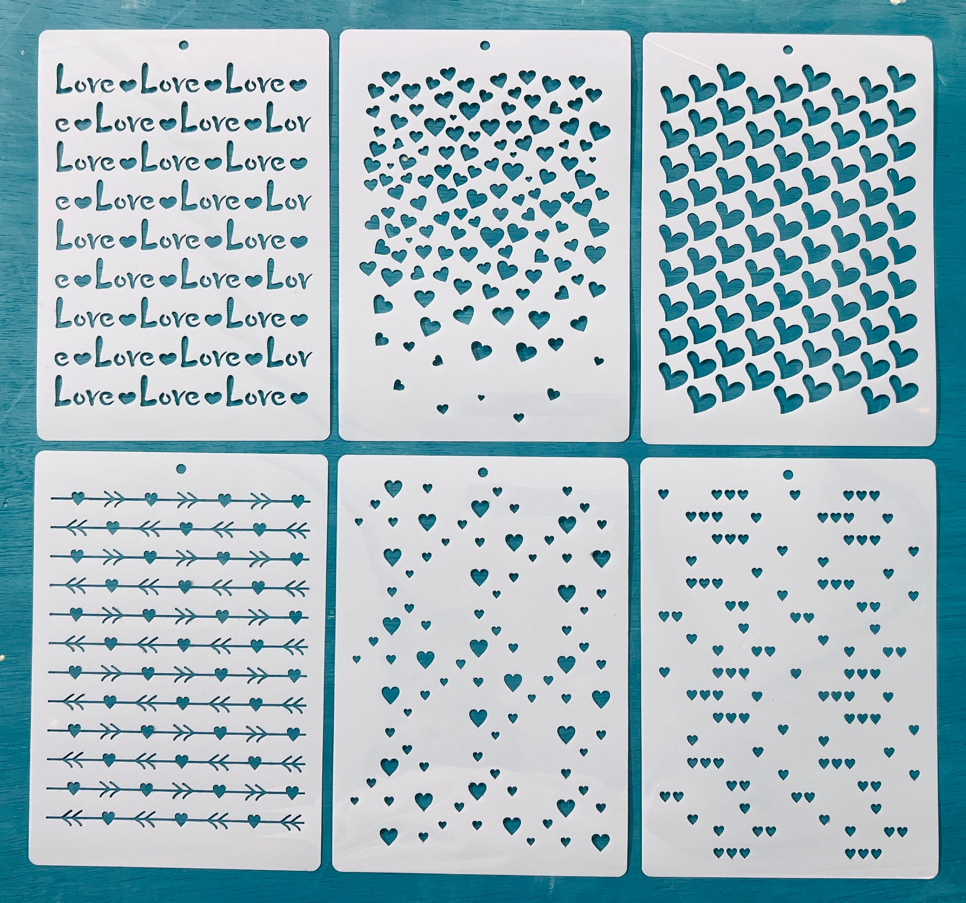 A stencil set featuring (8x6) “love” text, scattered hearts, and arrow patterns. Perfect for adding handwritten-style accents and meaningful details to projects. Includes all designs.