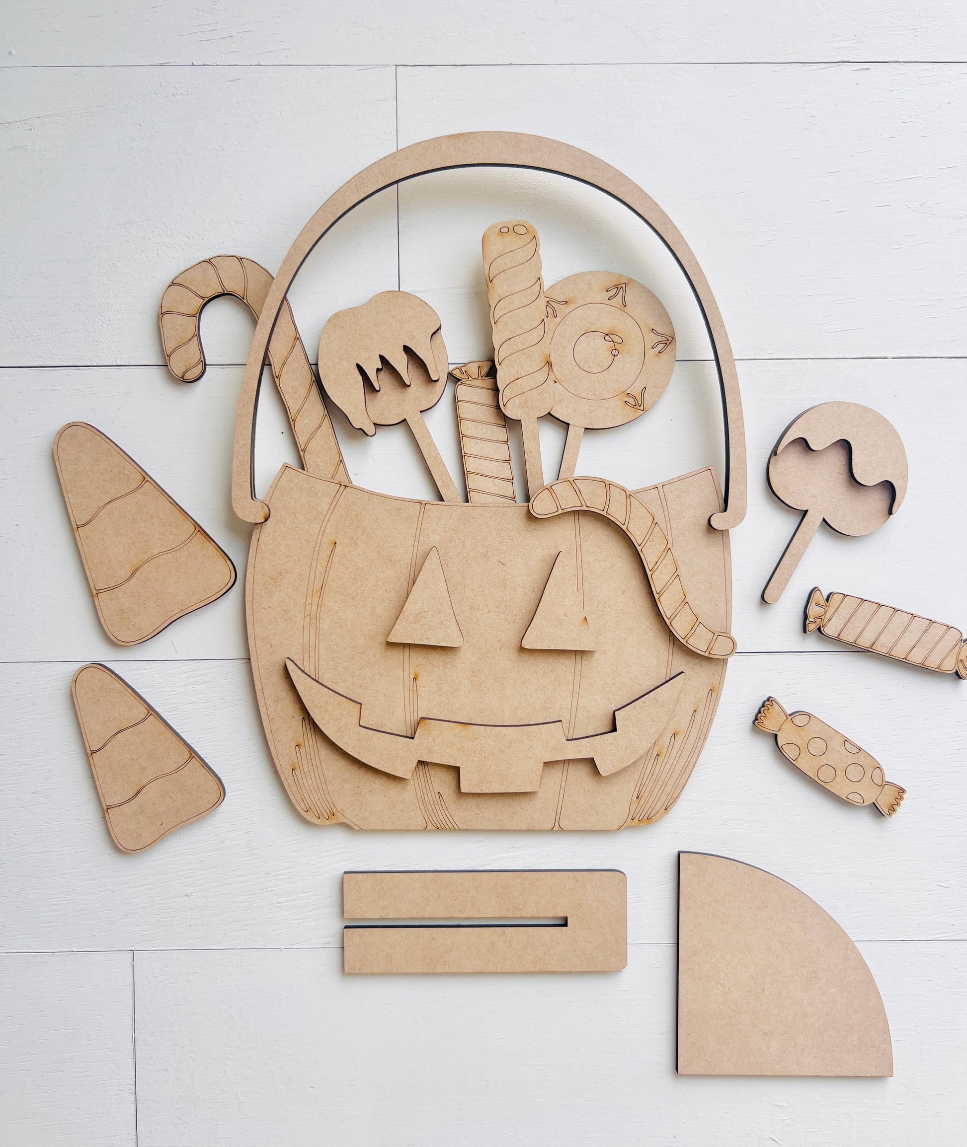 DIY wooden pumpkin candy bucket set, about 6" tall. Comes with candy pieces to paint and decorate—perfect for adding sweet Halloween charm to your décor.