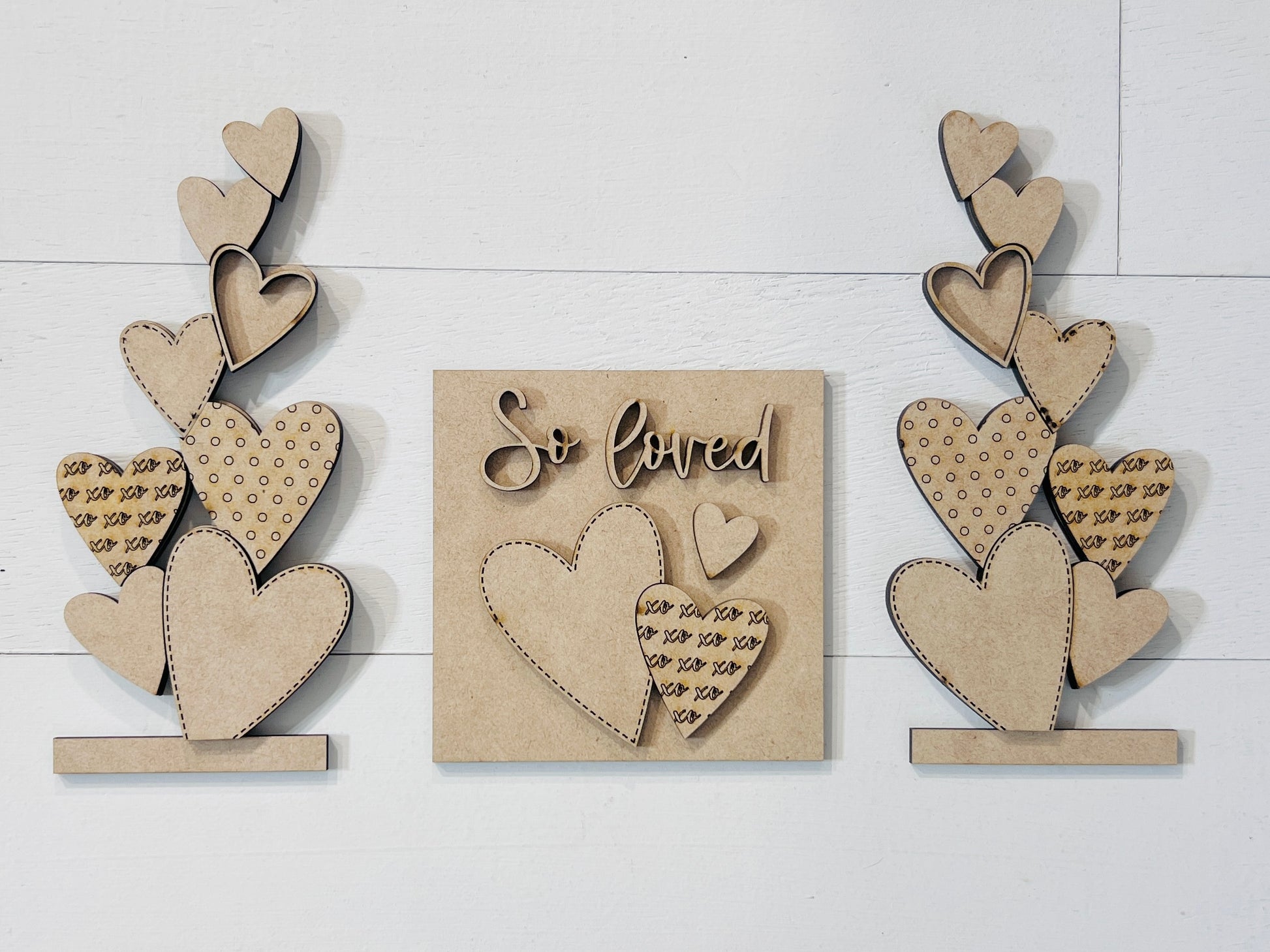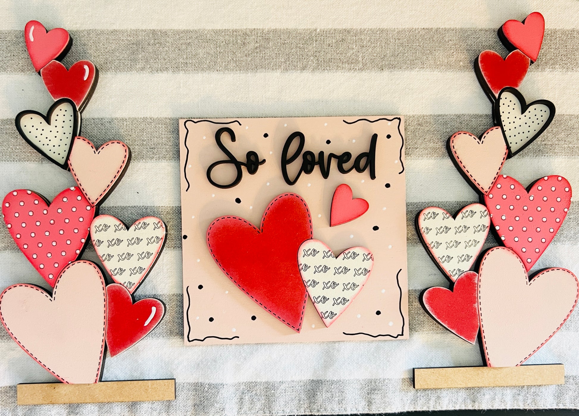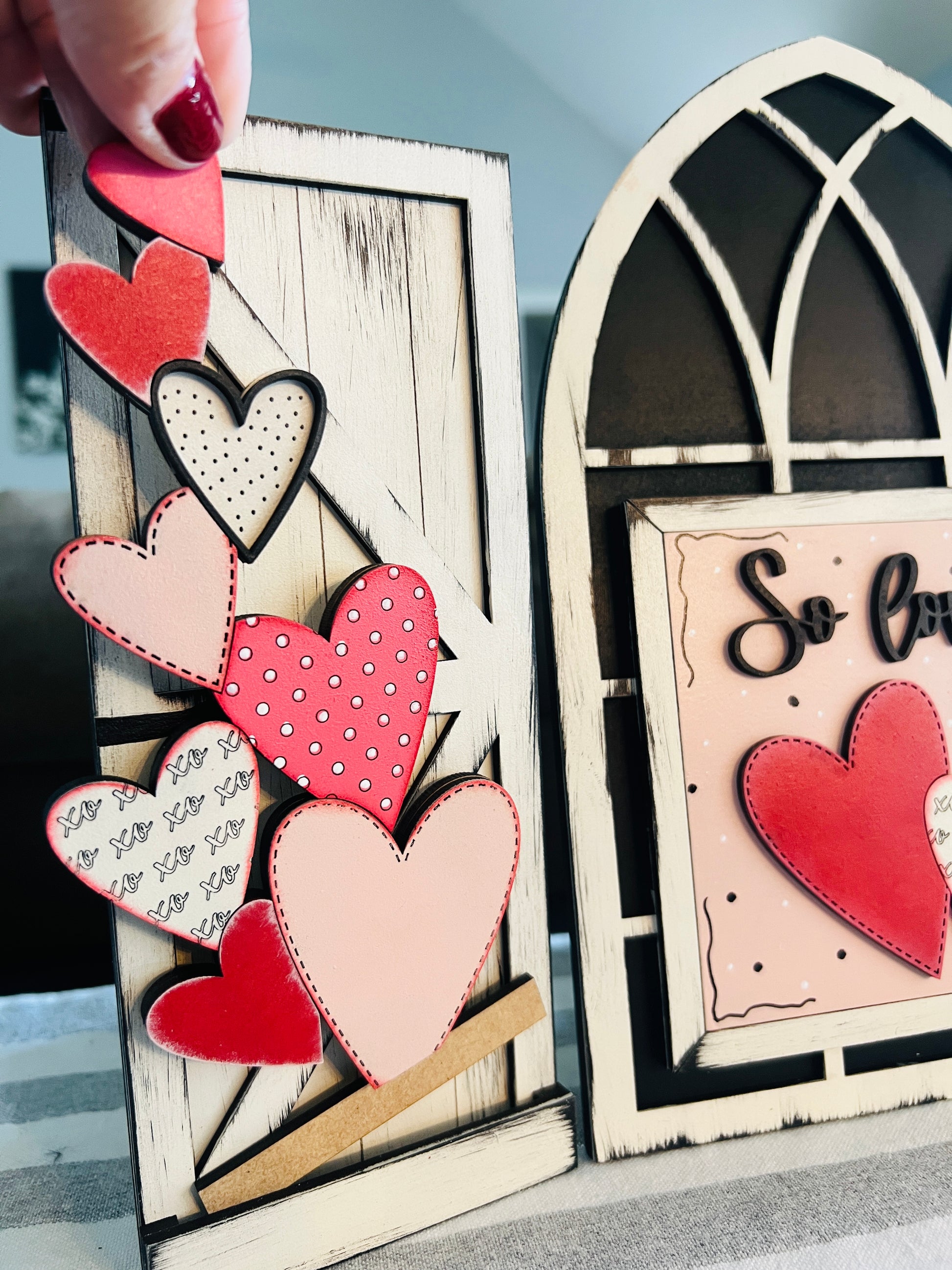 A laser-cut interchangeable insert featuring layered hearts and the phrase “So Loved.” Designed to fit the arched window base and easily swap in for Valentine or love-themed décor.