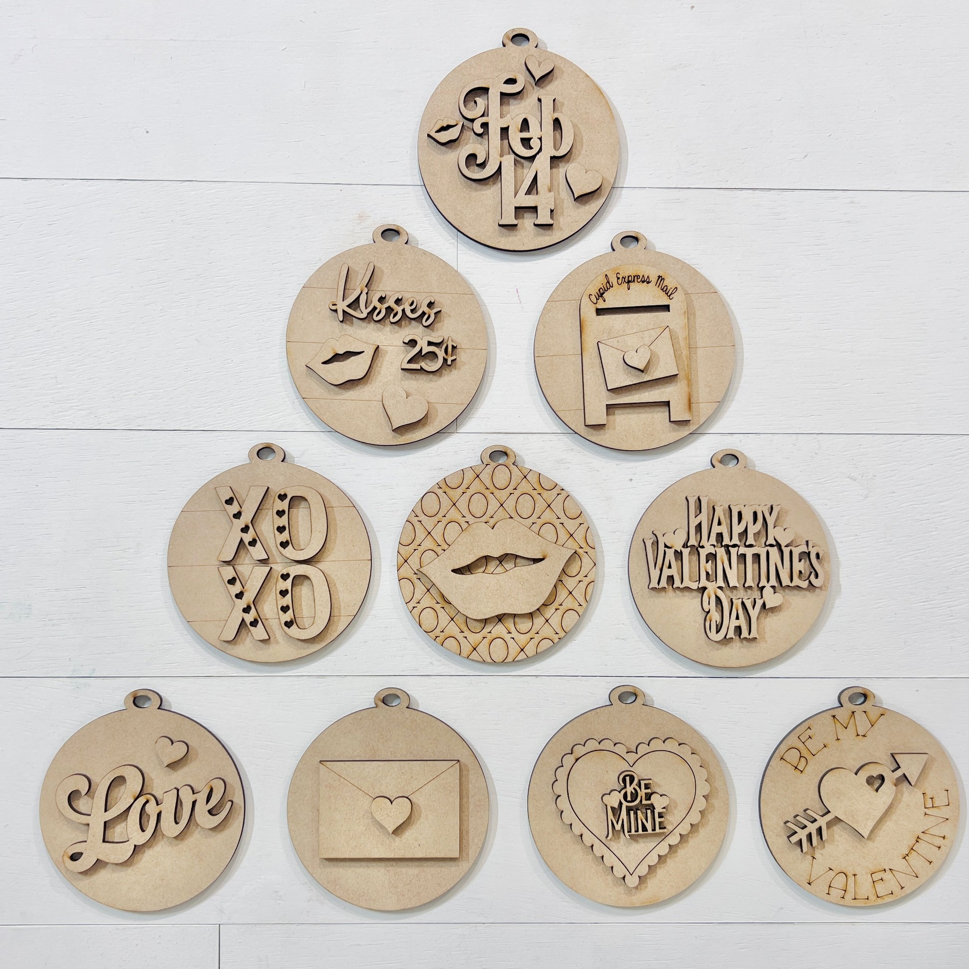 A coordinated set of laser-cut Valentine ornaments featuring hearts, kisses, love sayings, and playful designs. Perfect for tiered trays, small trees, or seasonal displays.